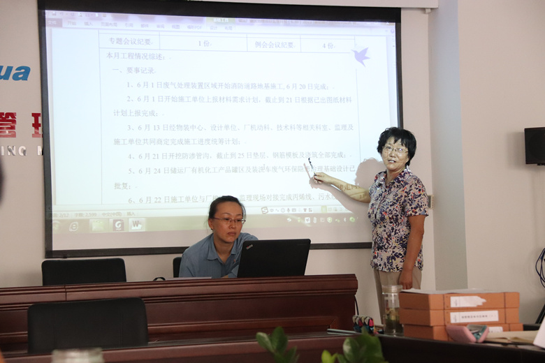 本次会议分为三个议程,首先是各项目部汇报工作情况,其中以储运厂项目部监理资料为案例,项目部总监徐新向大家展示了周报、月报、会议纪要以及工程进度及监理过程中存在的问题,总工办就其中存在的问题进行讲评。第二项议程总工程师马玉蓉讲评齐鲁资料组卷过程中的问题并对下一步的监理工作做出要求。最后,总经理王智祥做出总结、分析问题,提出解决措施,并对公司接下来的安排作出重要指示。